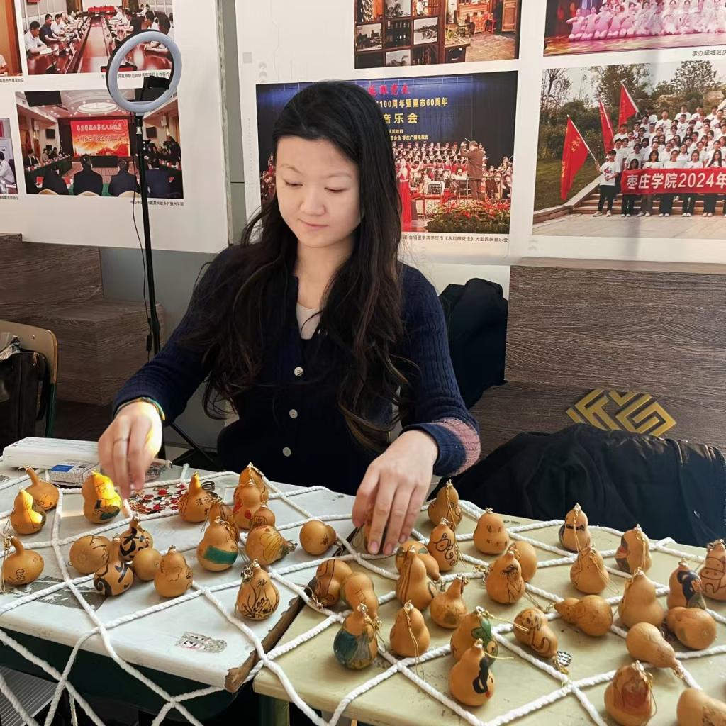 活动现场,协会成员热情地为师生介绍产品的设计理念和制作过程。不少同学表示,文创葫芦烙画和玉石珍珠手串等不仅是一件艺术品,更是一份承载文化情感的礼物。购买者纷纷表示,这些公司老员工自己手工创作的文创产品既能装点生活,也能作为送给亲朋好友的特别心意。