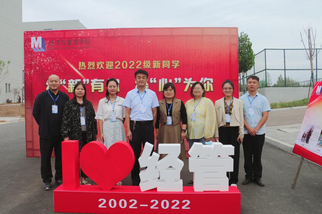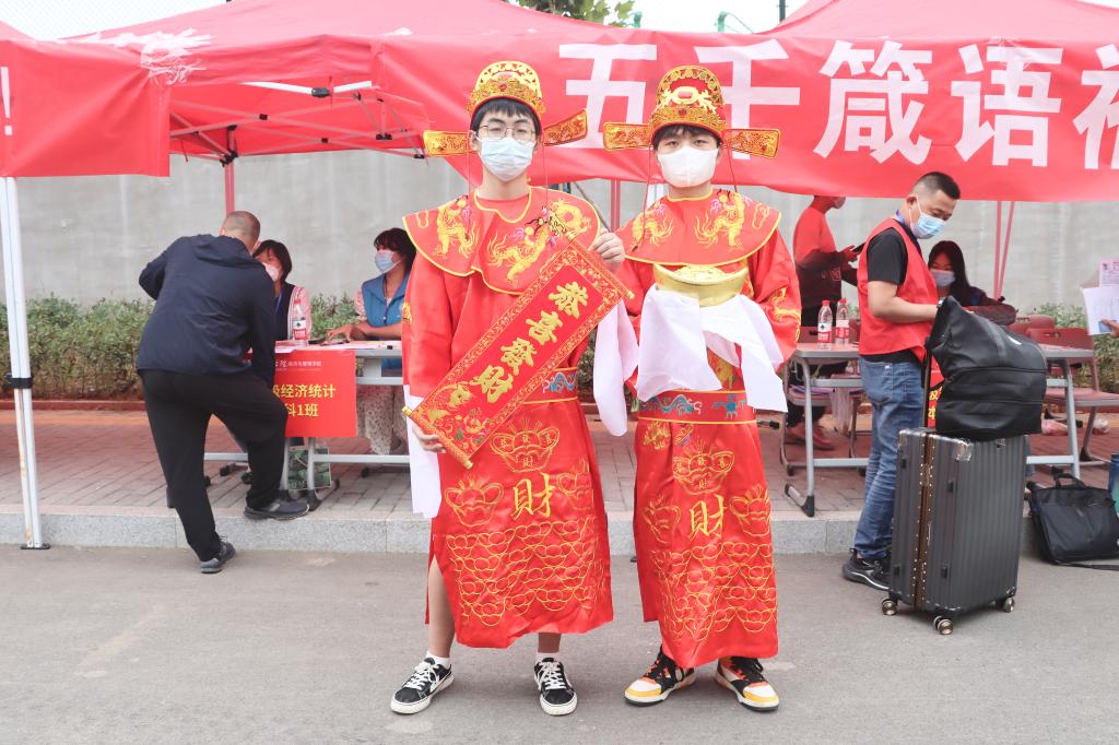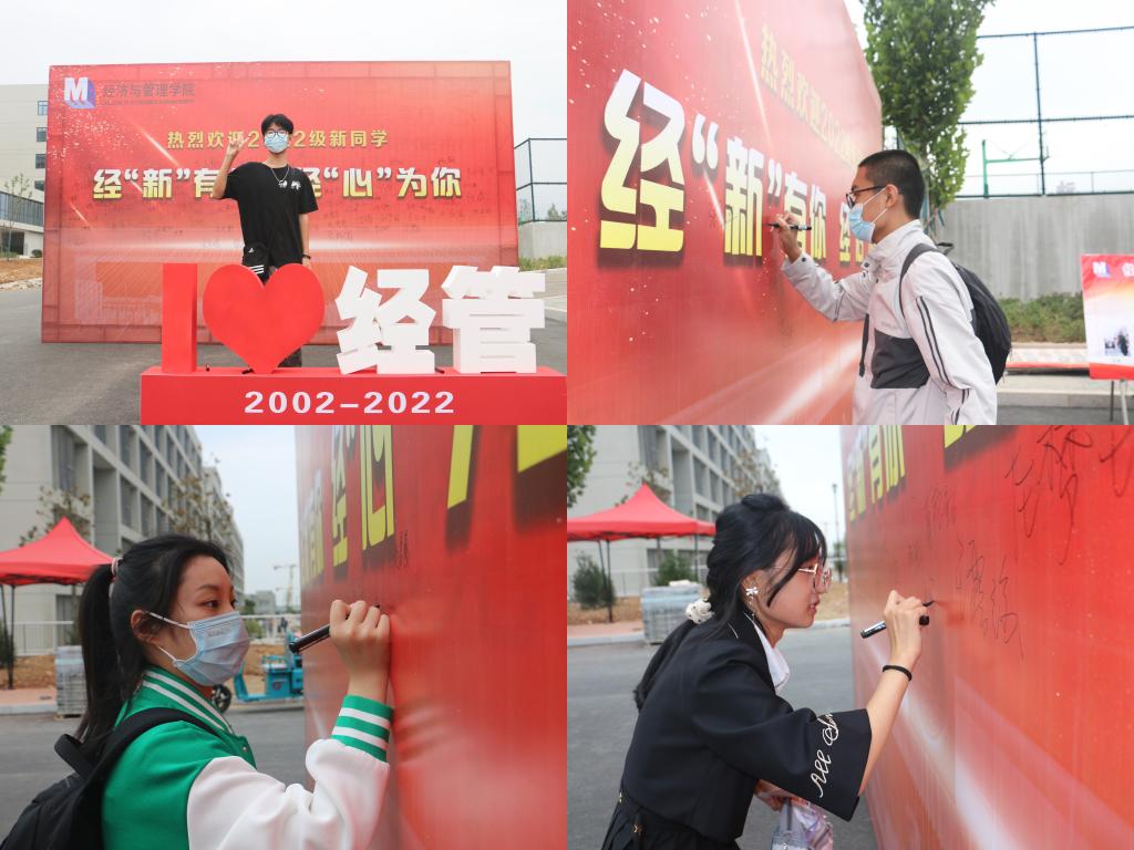 报到完成后,新生们纷纷去往带有经“新”有你,经“心”为你字样的背景板签名拍照,与两位志愿者装扮的迎新财神合影,留下开学第一天的珍贵记忆。
