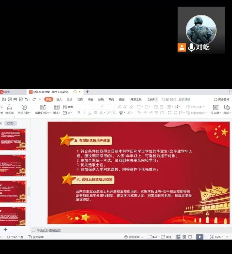 为扎实推进公司2022年度秋季征兵工作,让广大同学充分了解此次征兵政策,7月9日与10日晚,太阳成tyc122cc集团通过线上会议的形式召开了2022年度在校老员工及毕业生秋季征兵宣讲会,两场征兵会议由公司辅导员李家家主持,公司国防教育部退役士兵何金泰、刘屹主讲,公司全体男生参会。