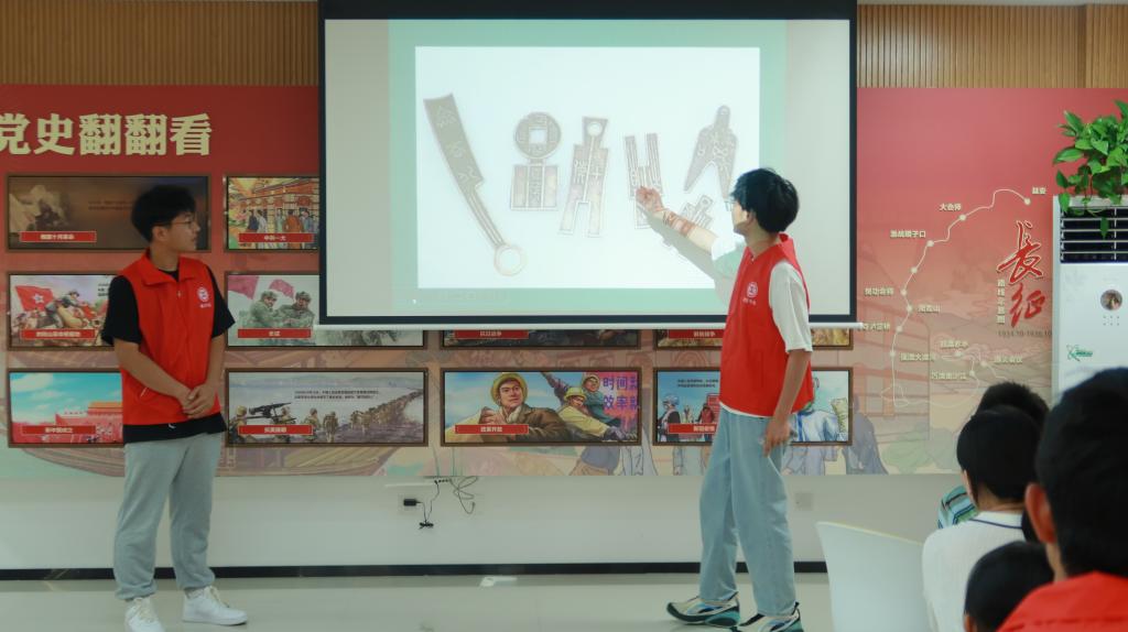 在课堂中,经管学子围绕“中国古代钱币发展的序列”和“从钱币文化看中华文明的连续性”两个部分进行讲述。首先介绍了中国货币发展的六个阶段,分别为贝币、春秋战国多种体系的货币、统一的半两钱制、汉至隋代的五铢钱制、唐至清代的宝文钱制和铜元,为我们呈现了中国古代钱币的发展简史。接着,从货币与文明、货币文化起点、货币发展阶段之间的密切关联、货币名称、货币的书法文字及相关民俗等六个方面展开阐述,向孩子们讲解了货币文化如何体现中华文明。
