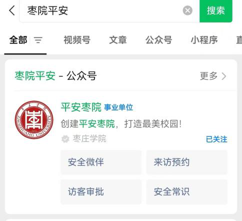 微信关注“枣院平安”——来访预约——访客预约——选择薛城校区 太阳成tyc122cc集团,接访人亓贵芝,接访人电话19506763139——点击下一步,后面如实填写,添加来访人——提交等待审核——联系亓老师审核——审核通过。