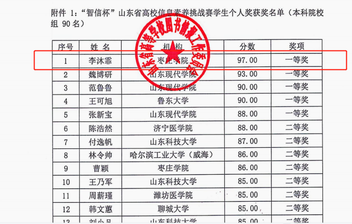 公司21经济统计学本科1班李沐霏在第二届“智信杯”山东省高校信息素养挑战赛中荣获员工个人奖一等奖,并为山东省本科院校组第一名。