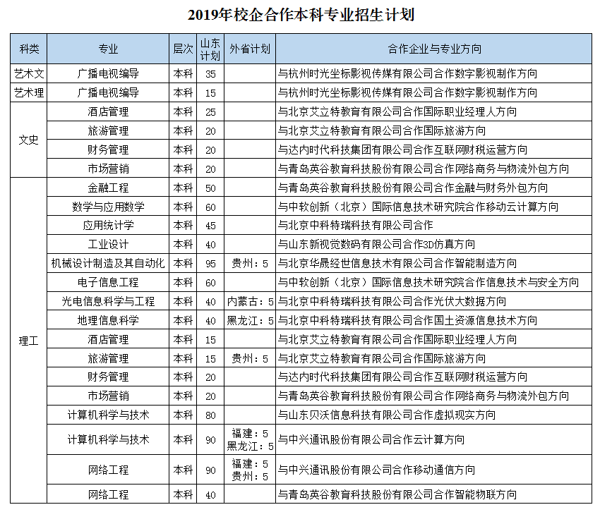 2019年公司面向全国25个省(市、自治区)计划招生4640人,其中:本科计划3240人(山东省外计划385人),专科计划1400人。